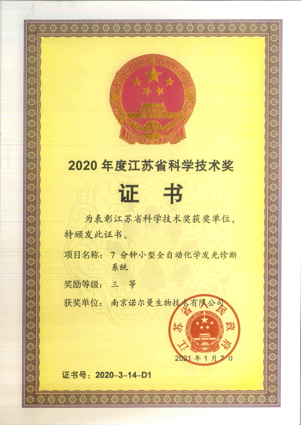 喜讯!热烈祝贺我司荣获“2020年度江苏省科学技术奖证书”